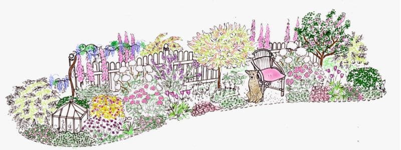 This year’s border is a gentle blend of nostalgic cottage‑garden style and a fresh, modern feel — inspired by the gardens I grew up in and the memories that shaped my love of gardening. Soft, calming colours, a classic cream picket fence and a playful willow dog sculpture create a welcoming, homely space that feels instantly familiar. It’s designed to reflect a typical UK garden and show how a small border can be both beautiful and meaningful.