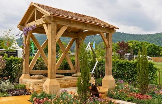 The garden reflects a walk around the Cotswolds, with a covered seating area which has taken inspiration from a church lychgate. In front of it there’s a water feature with a diamond shape which represents a stone-sided watercourse with a ford crossing.